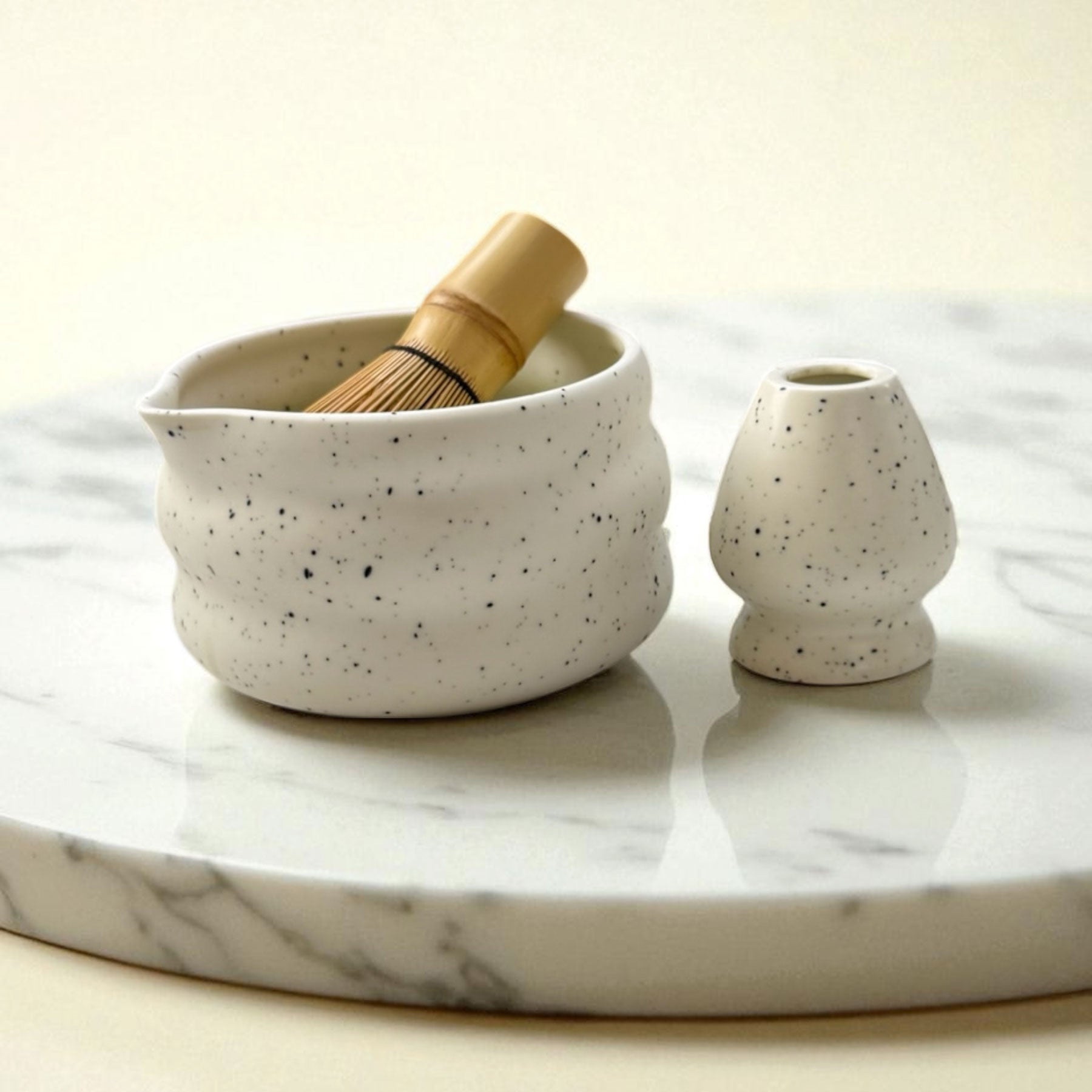 En smuk matcha-skål i lys keramik med mørke detaljer, bølget struktur og praktisk hældetud.